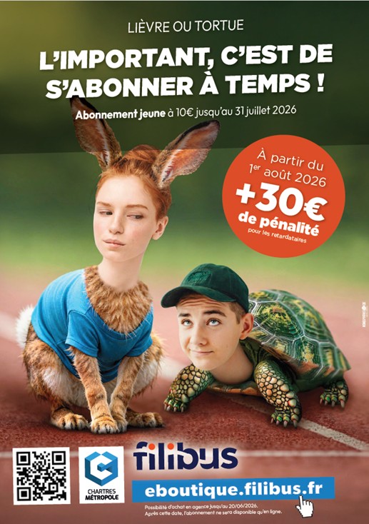 A partir du 1er mai 2026, les familles de Chartres métropole pourront se connecter sur la boutique en ligne du site Filibus (https://eboutique.filibus.fr) pour acheter et/ou renouveler l’abonnement de transport scolaire de leur(s) enfant(s) pour l’année scolaire 2026-2027.